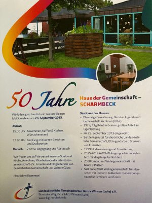 Scharmbeck. Die Landeskirchlichen Gemeinschaften (LKG) Bezirk Winsen laden ein zu einer Jubiläumsfeier, die am Sonnabend, 23. September, in Scharmbeck am Osterkamp 2 stattfindet. Das ehemalige Bezirks-Jugend- und Gemeinschafts-Zentrum „BJGZ“ wird 50 Jahre alt. Das heutige „Haus der Gemeinschaft “ wurde ab 1972 auf einem Grundstück gebaut, das die Eigentümerin der LKG geschenkt hatte. Einen großen Teil der Arbeiten erbrachten Mitglieder der LKG in Eigenleistung. Am 23. September 1973 wurde das Zentrum eingeweiht. Danach dienten seine Räume der örtlichen Landeskirchlichen Gemeinschaft, der EC-Jugendarbeit, der Kirchengemeinde Pattensen, Gremien und Freizeiten. Bekannt ist es auch als Ferien-Unterkunft für Kinder aus Tschernobyl.